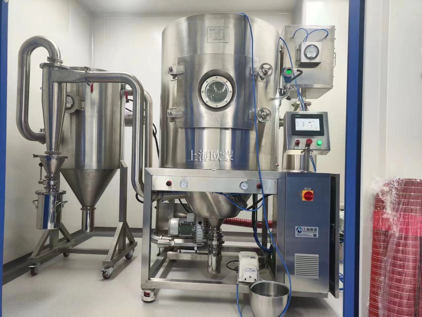 噴霧干燥機為開式循環(huán),并流式,離心式霧化。干燥介質(zhì)空氣經(jīng)過初、中效空氣過濾器過濾后根據(jù)操作指令由鼓風(fēng)機吸取再經(jīng)加熱器加熱通過高效過濾器的熱風(fēng)分配器進入噴霧干燥主塔。液體物料根據(jù)操作指令經(jīng)過蠕動泵,進入高速旋轉(zhuǎn)的離心噴頭,在離心力作用下被分散成小霧滴。在噴霧干燥主塔內(nèi),小霧滴與熱風(fēng)在充分接觸,沿其特定路徑進行熱交換后被干燥成為產(chǎn)品,然后通過旋風(fēng)分離器實現(xiàn)分離,固體物料被收集,氣體介質(zhì)再經(jīng)過過濾后被排出。整套噴霧系統(tǒng)易清潔、無死角,符合GMP要求。